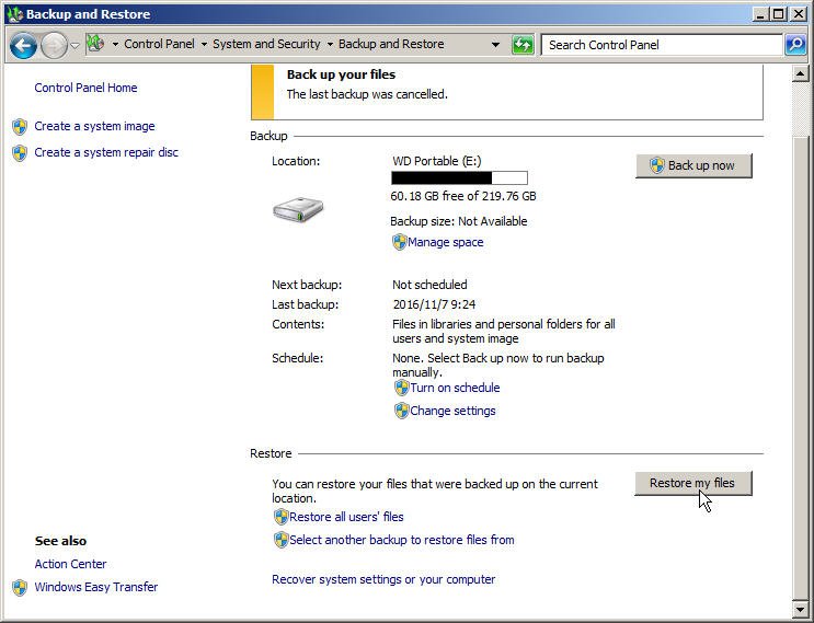 2. In the Backup and Restore screen, click Restore my files and follow the wizard to restore your files.