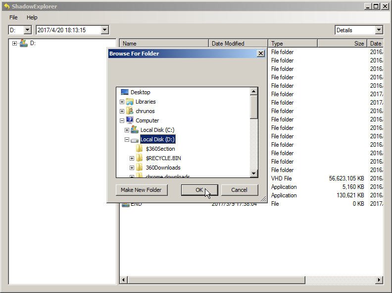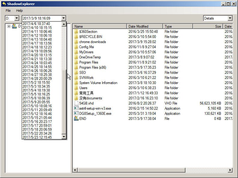 1. In the main interface of Shadow Explorer, select the volume and date to restore the files. In my case, I choose D: drive. To my surprise, I have 46 shadow copies of D: drive.