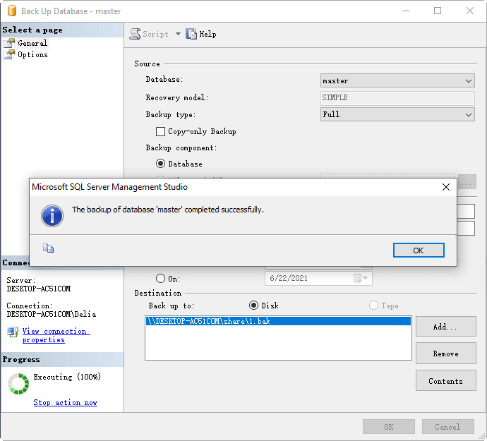بعد ذلك ، يجب أن تتمكن من نسخ احتياطي لقاعدة بيانات SQL إلى المشاركة دون وجود خطأ 5.