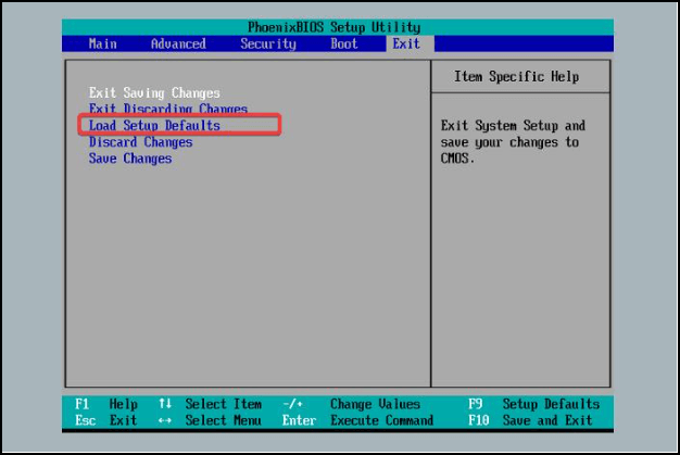 2. Navigate to the Reset to Default or Load Setup Defaults option.