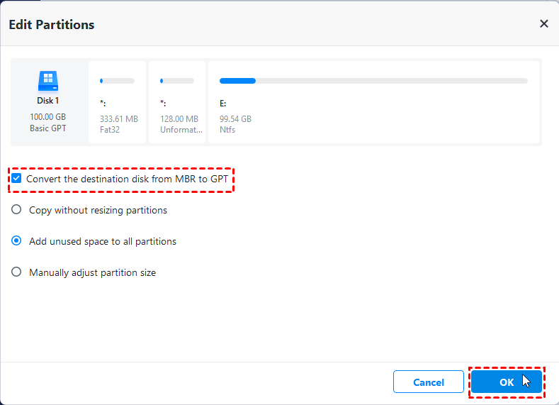 Step 4. If the SATA SSD is an MBR disk and you haven’t converted it before, click Edit Partitions and tick Convert the destination disk from MBR to GPT, then click OK.