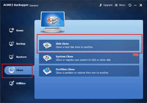 1. Download, install and launch SSD cloning software - AOMEI Backupper Professional. Select “Disk Clone” under “Clone” tab.