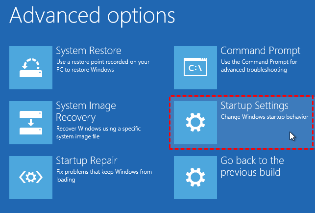 - On the next screen, you will see a large number of options. Select Startup Settings here.