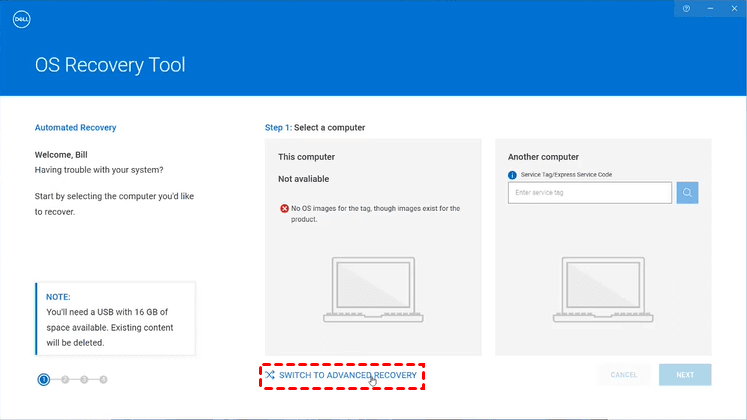 Step 2. If automatic detection fails, choose SWITCH TO ADVANCED RECOVERY. Select the correct Windows version that originally shipped with your Dell device. This bypasses detection errors and helps ensure compatibility.