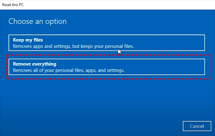 3. Then, your computer will restart to recovery environment, select “Remove everything” in the “Choose an option” window.