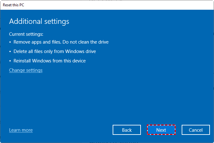 Click Change settings and you can choose to clean the drive and remove all files from all drives by turning on the corresponding switch. Click Confirm to save your settings and then click Next.