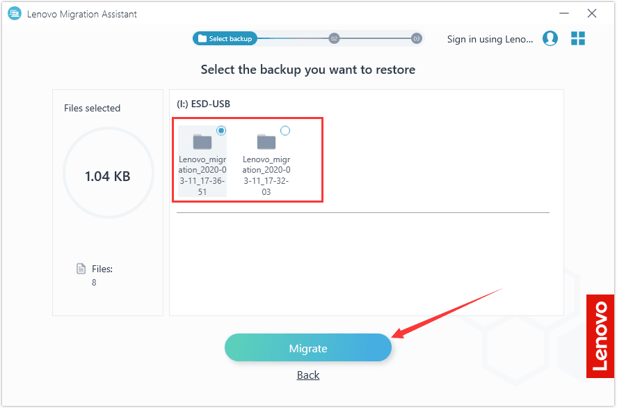 Step 4. When it’s done, connect the USB to the target computer, run Lenovo Migration Assistant, choose USB > Restore data to select the backed-up files from the USB drive > click Migrate to restore them to your new computer.