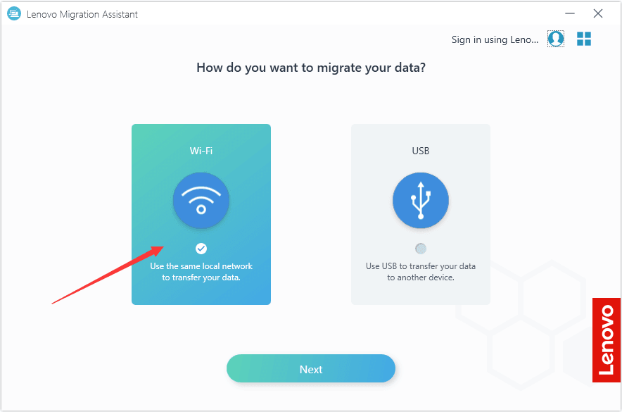 Step 1. Get Lenovo Migration Assistant downloaded and installed on your two computers, run this tool on both devices, and select Wi-Fi to click Next.