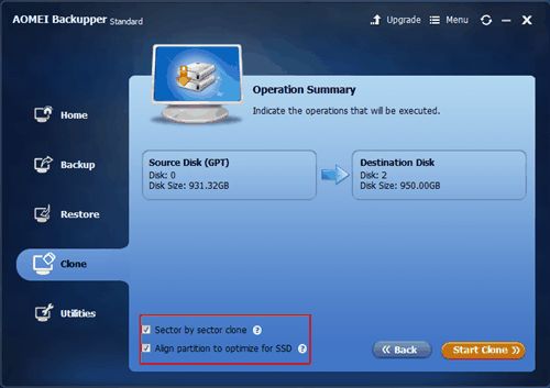 To clone disk (HDD/SSD) sector by sector, you need the best sector by sector clone software - AOMEI Backupper Professional. With it, you can choose to clone sector by sector or not. The steps are same as a normal disk clone, you just need to check the sector by sector clone option before cloning. So you can enjoy all the advantages in disk clone: