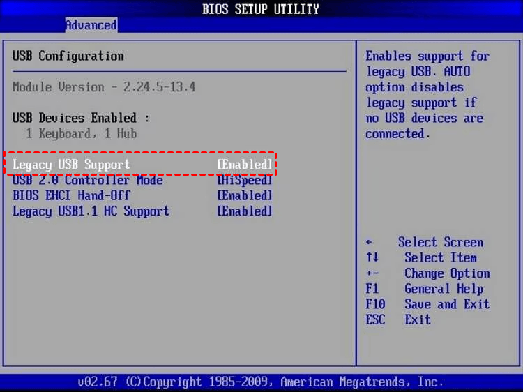 Step 3. Look for BIOS settings related to USB configuration, like Legacy USB Support, which is enabled.