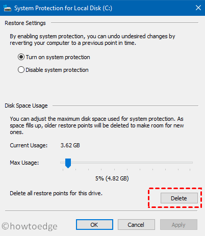 - In the next window, click on Delete to remove old restore points that are no longer necessary.