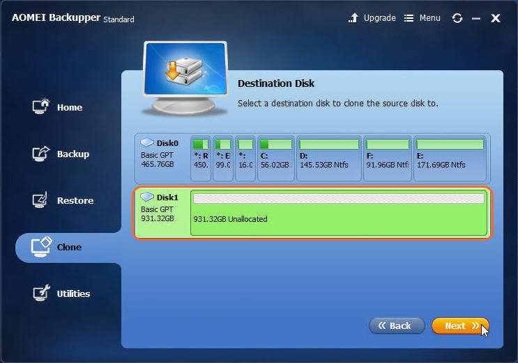 Before you start, you may backup files on the destination HDD, because the cloning process will overwrite the destination disk. Then, follow the guidance below: