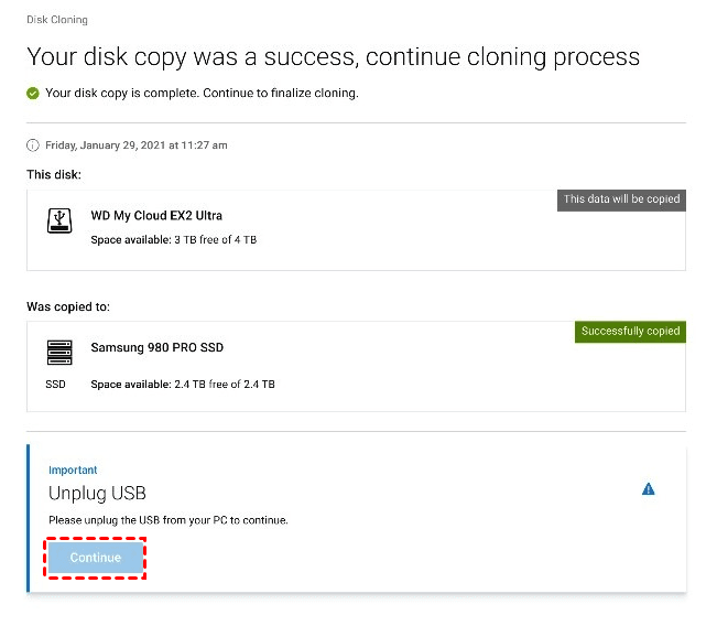 Step 9. Click Continue to clone data from the transition disk to the new SSD.