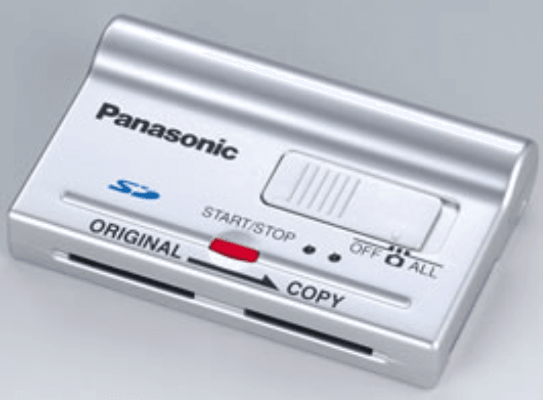 In fact, Panasonic Japan has introduced the Panasonic SD card copier, which helps you copy everything from one Panasonic SD card to another or just copy images and videos saved in a special folder. It is very easy to operate, you just need to insert one of the Panasonic SD cards in the Original slot and the other in Copy slot, then press the red switch and it will copy your SD card files. But it is not free, you need to pay for it $35 before using it.