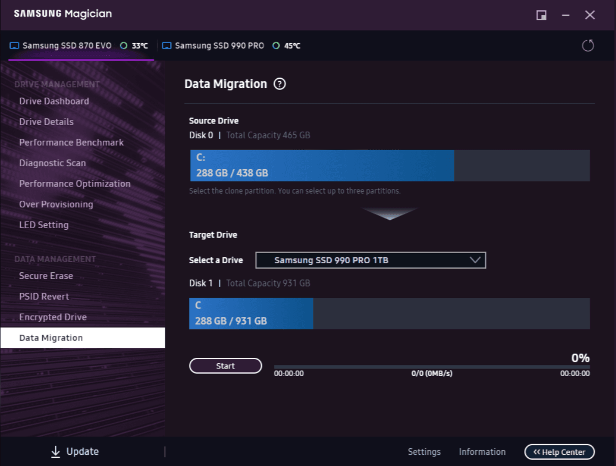 Step 4. Then, click on Start to clone your hard drive with Samsung Magician Data Migration.