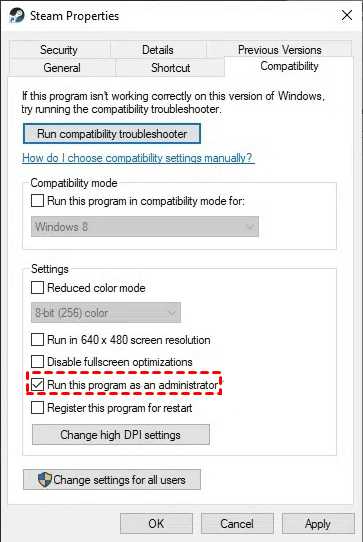 Step 5. Switch to the Compatibility tab. Scroll down to Settings and check Run this program as an administrator. Finally, click Apply and OK.