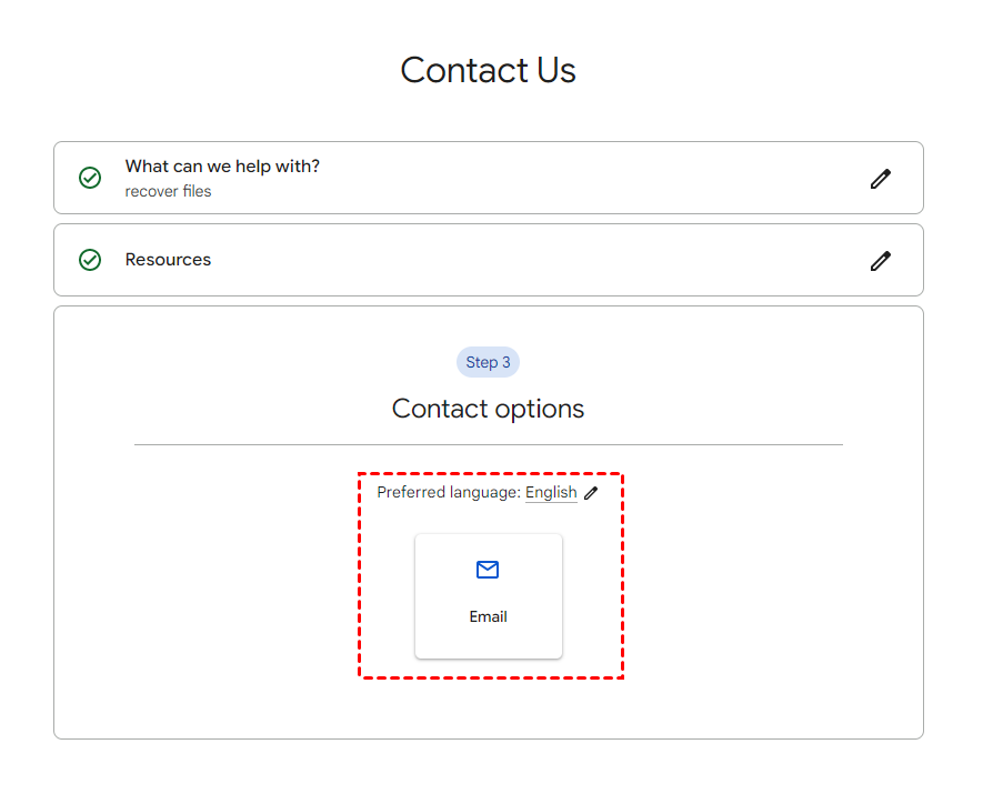 Step 3. To contact Google for assistance, select your Preferred language and click the Email option.