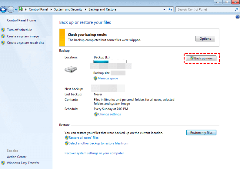♦ Tip: If you want to make a backup in this Windows built-in tool, you can click Back up now to avoid data loss again.