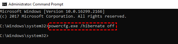 2. Then, type the command: powercfg.exe /hibernate off and press Enter. It will delete the hibernation file on the system partition automatically.