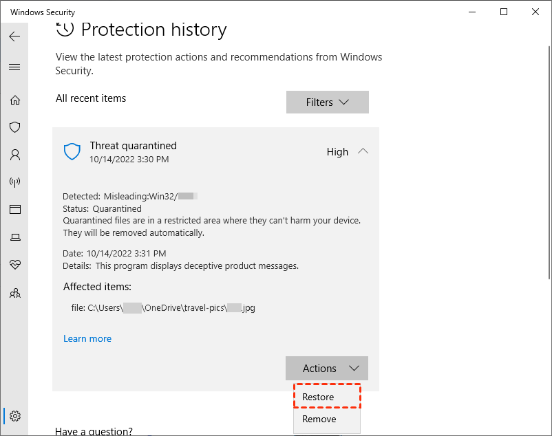 You could go and check the antivirus quarantine list and see if your photos were there. Here we will take Windows Defender as an example.