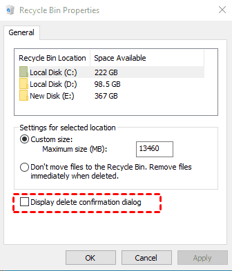 - Enable deletion confirmation. Right-click the Recycle Bin icon and select its Properties option. Then, select the General tab and check the Display delete confirmation dialog option. Save the changes and leave the Properties window.