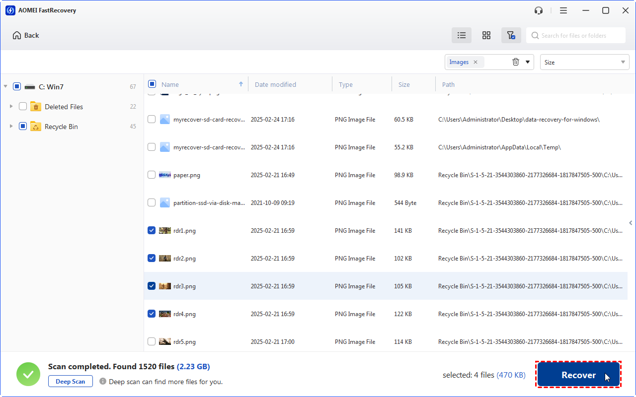 - Advanced scanning method: AOMEI FastRecovery runs Quick Scan & Deep Scan automatically to search all the recoverable files. Specify the filename, saved path, date, or size to filter your needed files.