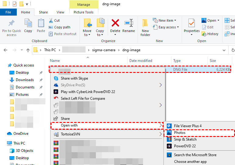 » Please connect your camera SD card to Windows > open the saved path of your DNG images > right-click on one DNG file > select Open with > Photos.