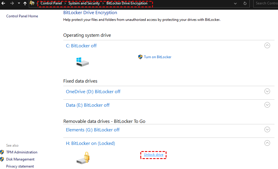 Step 1. Go to Control Panel and select System and Security > BitLocker Drive Encryption.