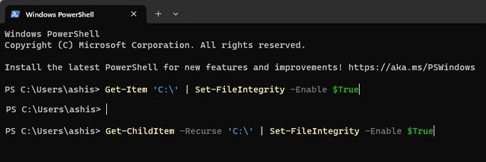 - C:\> Get-ChildItem -Recurse 'C:\' | Set-FileIntegrity -Enable $True