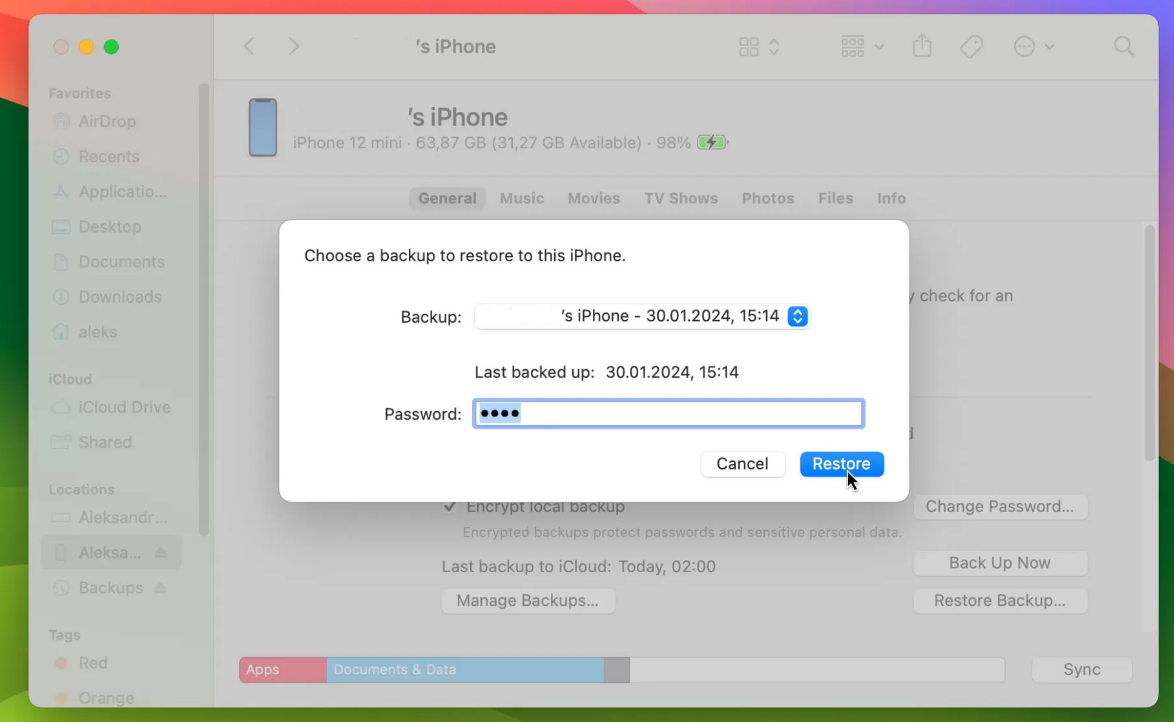 Step 5. Click the Restore button to confirm that you are ready to restore your iPhone from the selected backup and enter your password if prompted.