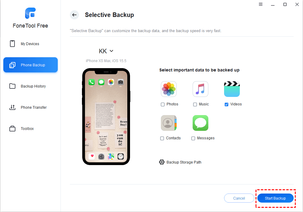 Step 3. Set “Backup to storage path” and then click “Start Backup”.
