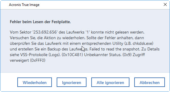 Benutzerfall: Acronis Fehler beim Lesen der Festplatte tritt auf