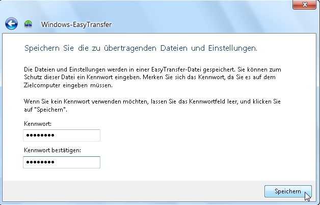 Schritt 5. Legen Sie ein Passwort für das Backup fest oder lassen Sie es leer, klicken Sie auf Speichern und wählen Sie einen Zielort. Die Datei wird „Windows Easy Transfer - Dateien von alten Computern“ genannt (mit dem Suffix .MIG).