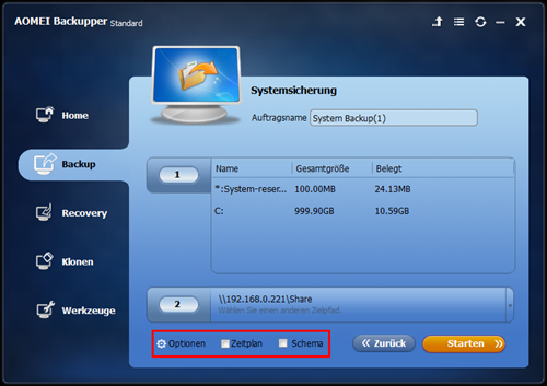 Schritt 4. Hier haben Sie bereits die Arbeit für die Sicherung auf NAS erledigt. Ein automatisches Backup auf NAS erfordert jedoch einen weiteren Schritt, d. h. klicken Sie auf Zeitplan, bevor Sie auf Starten klicken, um das Einstellungsfenster für die Planung der Sicherung zu öffnen.