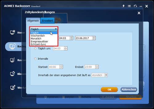 - Es wird Ihnen ein Fenster angezeigt, in dem Sie die automatische Datensicherung auf NAS auf täglich, wöchentlich, monatlich oder durch Event Trigger (in der Professional-Version) einstellen können, und Sie können den Zeitpunkt für die Ausführung wählen.