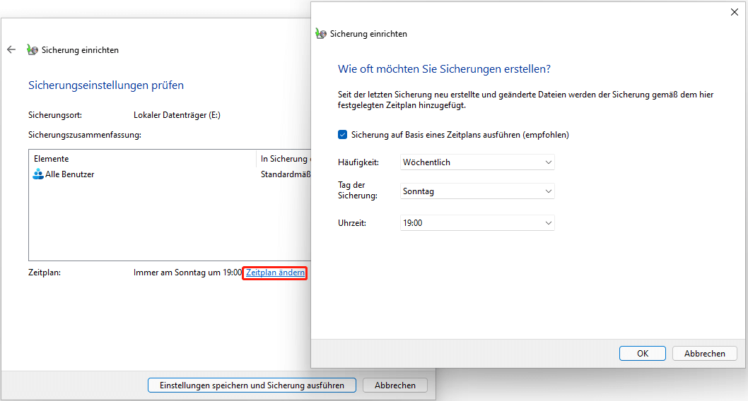 Schritt 6. Klicken Sie auf „Zeitplan ändern“, um die automatische Backup-Zeit festzulegen. Klicken Sie dann auf „Einstellungen speichern und Sicherung ausführen“.