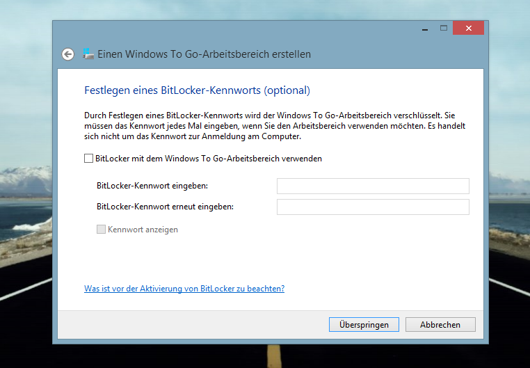 Schritt 7. Wählen Sie, ob Sie ein BitLocker-Kennwort festlegen möchten. Wenn Sie ein Kennwort festlegen möchten, geben Sie Ihr Kennwort ein, aber Sie müssen Ihr Kennwort eingeben, um das Laufwerk in Zukunft zu entsperren. Wenn nicht, klicken Sie auf Überspringen, um fortzufahren.