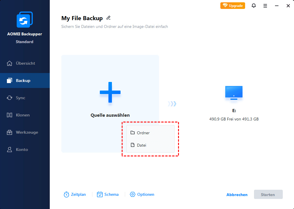 Schritt 1. Starten Sie AOMEI Backupper Standard, klicken Sie nacheinander auf „Backup“ und „Dateisicherung“. Sie können stattdessen auch „Systemsicherung“, „Festplattensicherung“ und „Partitionssicherung“ wählen.
