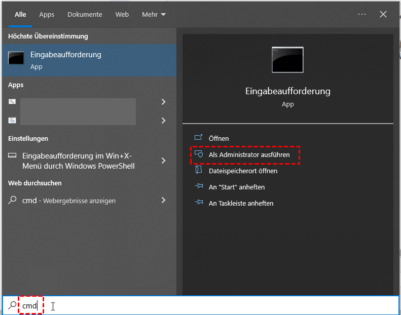 Schritt 1. Drücken Sie Windows + S, um die Suchleiste zu öffnen. Geben Sie cmd in die Suchleiste ein und wählen Sie Eingabeaufforderung aus dem Ergebnis.
