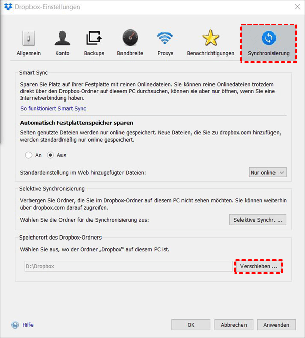 Schritt 3. Wählen Sie die Registerkarte „Synchronisierung“, und Sie sehen den „Speicherort des Dropbox-Ordners“.