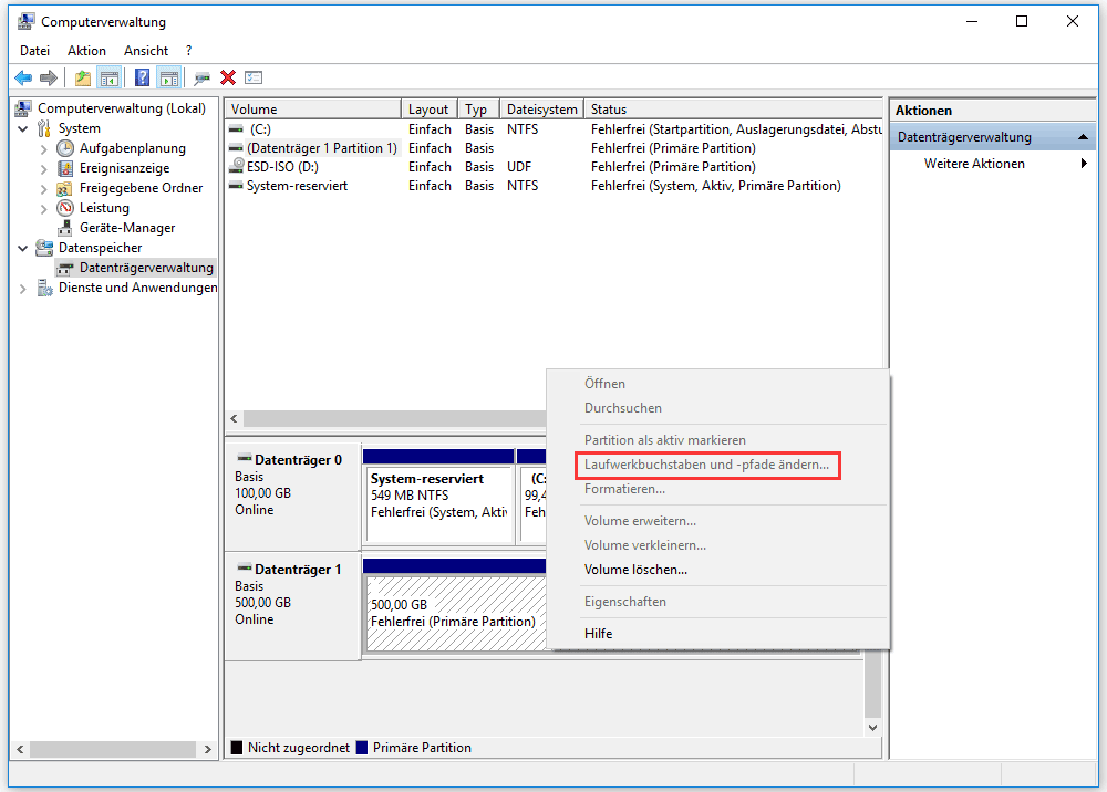 Schritt 1. Gehen Sie zu „Dieser PC“ > Verwaltung“ > „Computerverwaltung“ > „Datenspeicher“> „Datenträgerverwaltung“.