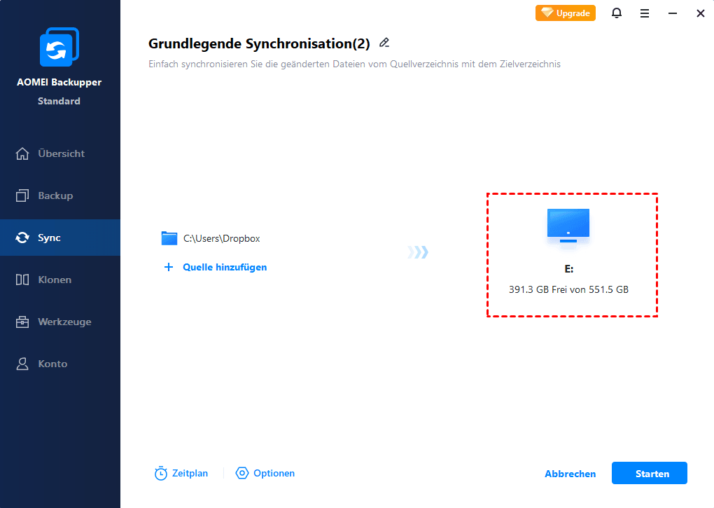 Auf der anderen Seite haben Sie eine einfachere Möglichkeit, Dropbox mit externer Festplatte zu synchronisieren. Die kostenlose und dennoch leistungsstarke Dateisynchronisierungssoftware AOMEI Backupper hilft Ihnen, Dateien einfach und sicher von Dropbox auf eine externe Festplatte zu kopieren.