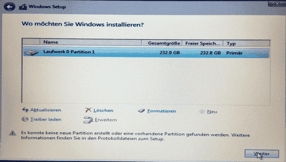 Ich habe gerade eine alte Festplatte aus meinem Laptop entfernt und durch eine neue leere SSD ersetzt (weil ich eine vollständige und saubere Installation von Windows 10 haben wollte). Wenn ich versuche, Windows 10 mit einem USB-Laufwerk zu installieren, erhalte ich immer eine Fehlermeldung: Wir konnten keine neue Partition erstellen oder eine vorhandene finden. Es wird auf das Setup-Protokoll verwiesen, aber ich kann das Protokoll für dieses Problem weder auf dem USB-Laufwerk noch auf der neuen SSD finden, daher kann ich nicht feststellen, worin das Problem besteht.