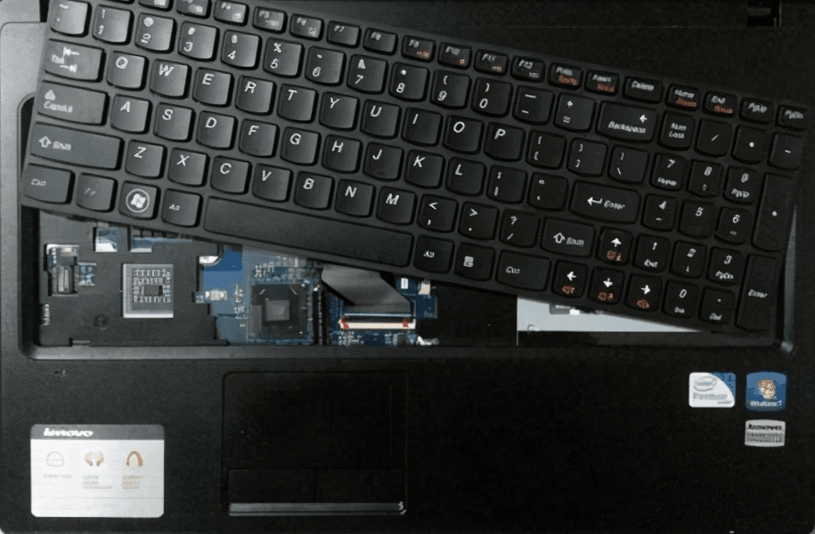 8. Installieren Sie die Tastatur und den Bildschirm. Legen Sie das Notebook mit der Vorderseite nach oben und schließen Sie das Flachbandkabel der Tastatur an die Hauptplatine an. Setzen Sie dann die Tastatur in den Tastaturschacht ein und drücken Sie sie leicht an.