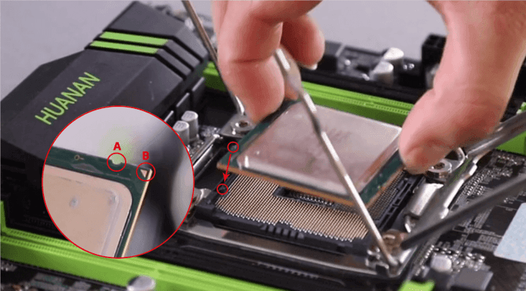 2. Installieren Sie die CPU. Heben Sie den Hebel neben dem CPU-Steckplatz in eine vertikale Position, richten Sie die Positionen A und B der CPU an den Steckplätzen aus und drücken Sie den Hebel vorsichtig nach unten.