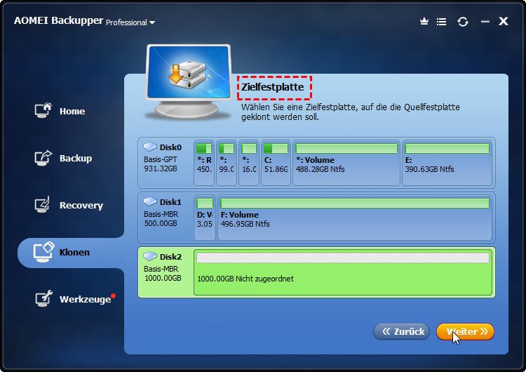 Schritt 4. Wählen Sie hier die neue Festplatte als die Zielfestplatte aus.