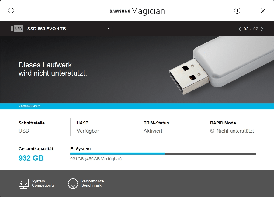 Die Samsung Magician Software (neueste Version 5.2.1) hat etwas über meine SSD 860 evo 1 TB zu sagen, sie sagt, dass dieses Laufwerk nicht unterstützt wird. Wie kann ich das Problem lösen?