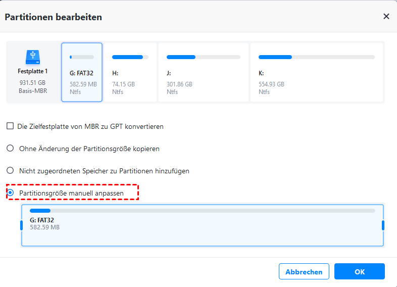 Laut Benutzer-Feedback berichten einige Benutzer, dass die geklonte Festplatte nach dem Klonen der Festplatte auf eine größere Festplatte eine falsche Größe anzeigt. Wenn dies der Fall ist, können Sie allen Partitionen nicht zugeordneten Speicherplatz hinzufügen oder die Partitionsgröße mit der Funktion „Partitionen bearbeiten“ manuell anpassen.