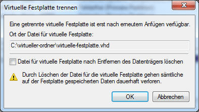 Oder Sie können mit der rechten Maustaste auf den gemounteten Datenträger klicken und Virtuelle Festplatte trennen wählen. Dadurch wird die Abtrennung sofort ausgeführt.