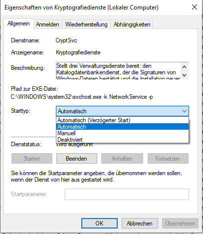Doppelklicken Sie auf Kryptografiedienste, wählen Sie den Starttyp Deaktiviert im Allgemein-Tab und klicken Sie dann auf Anhalten und OK, um Änderungen an diesen Diensten vorzunehmen. Danach gehen Sie erneut zum Allgemein-Tab und wählen Automatisch aus, klicken Sie auf Übernehmen > Start > OK.